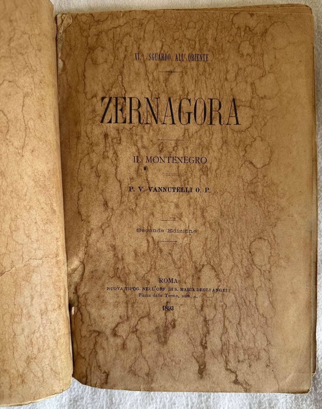 Prima edizione del 1893 di questa opera di viaggio in Montenegro scritto dal cardinale e arcivescovo cattolico Vincenzo Vannutelli (1836-1930). All'interno: Lago di Scutari, su pei monti, Sull'Adriatico, Zettigne, Episcopio, Una gloria cattolica del Montenegro, Il Montenegro nella questione di Oriente ec. Segue la seconda parte "Nuove chiese affricane breve racconto di viaggio". In buone condizioni. Copertina morbida coeva con titolo manoscritto al dorso in buone condizioni con lievi usure marginali. Legatura in buone condizioni. Pagine in buone condizioni con rare fioriture. Bruniture al frontespizio. In 8. cm 19,5x13,5. Pp. 200.First edition of 1883 of this work of tarvel about Costantinople written by the catholic cardinal and archibyshop Vincenzo Vannutelli (1836-1930). Name of the author at the end of the text. Inside: Fra Galata e Istambul, La Grande Basilica, Il Patriarcato greco, Chalchi, Armeni e Bulgari, Ebrei e protestanti, Kadichioi, Macrichioi. Il Corno d'oro e il Bosforo, At the end of XIX century, the last work is middle east ec. In good conditions. Soft coeval cover with handwritten title in the spine in good conditions lightly worn in the extremities. Binding in good conditions. Pages in good conditions with occasional foxing. Yellowings in the title page. In 8. cm 19,5x13,5. Pp. 200.