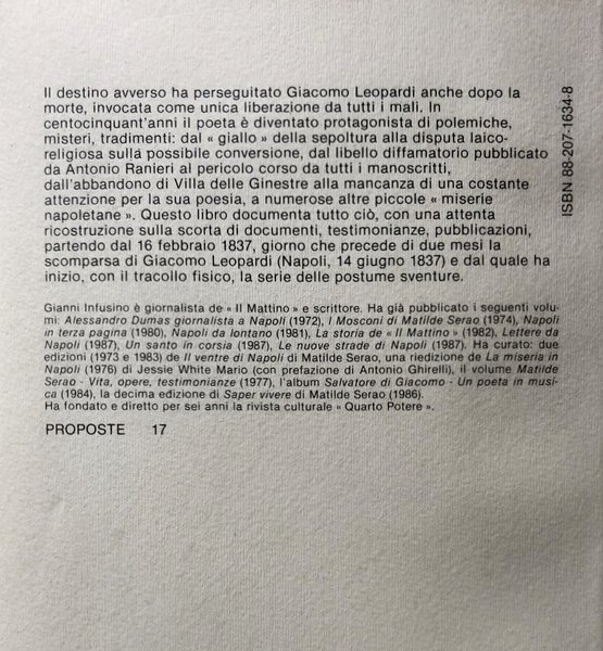 Soggetti: Critica Letteraria, Linguistica, Filologia, Lingua e letteratura italiana, Classici, Ottocento, Poesia, Pensiero e poetica di Giacomo Leopardi, Biografie, Napoli, Colera, Conversione, Morte, Polemiche, Mistero, Sepoltura, Ranieri, Sodalizio, Manoscritti contesi, Villa delle Ginestre, Torre del Greco, Illuminismo, Lettere, Carteggi, Memorie, Studi, Libri rari, Napoletanità, Intelletuali, Literary Criticism, Linguistics, Philology, Italian Language and Literature, Classics, Nineteenth Century, Poetry, Thought and Poetry, Biographies, Naples, Cholera, Conversion, Death, Controversy, Mystery, Burial, Sodality, Contested Manuscripts, Enlightenment, Letters, Scriptures, Memoirs, Studies, Rare Books, Neapolitan, Intellectuals