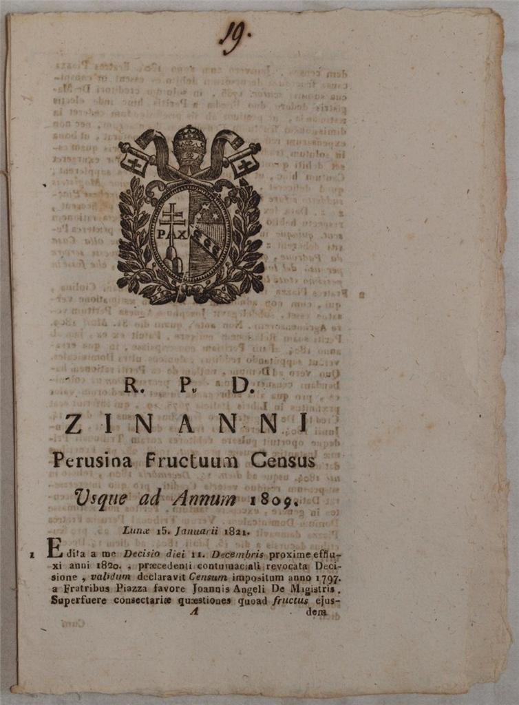 In 4. Dim. 28,5x21,5 cm. Pp. (5). Interessante pubblicazione del 1821, una sentenza del Tribunale della Sacra Rota del 15 Gennaio 1821 per una causa nella diocesi di Perugia. Si tratta della causa sulla sentenza del 11 Dicembre che richiedeva un censo per l'anno 1797 dei fratelli Piazza a favore di Giovanni Angeli de Magistris. I fratelli Piazza dovevano i frutti del debito contratto con De Magistris. In buone condizioni. Copertina assente. Legatura assente. All'interno le pagine si presentano in buone condizioni con fioriture e bruniture. Interesting pamphlet of 1821, a sentence of the Trial of Sacra Rota for a trial of 15th of January 1821 in the diocesis of Perugia. It is the trial for the sentence of the 11st of December which called a census for the year 1797 of the brothers Piazza in favour of Giovanni Angeli de Magistris. The brothers Piazza had to give the fruits of the debt they have with De Magistris. In good conditions. Cover is missing. Binding is missing. Inside pages are in good conditions with foxings and yellowings. Worn edges.