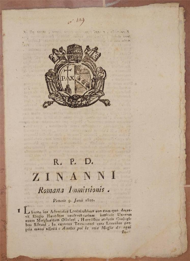 In 4. Dim. 29x21 cm. Pp. (3). Interessante pubblicazione del 1820, una sentenza del Tribunale della Sacra Rota del 9 Giugno 1820 per una causa nella diocesi di Roma. Si tratta della causa per un immissione ereditaria. L'avvocato Lorenzo Loreni nominò come usufruttuaria la moglie Margherita Olivieri e come eredi i coniugi Silvani negandole la possibilità di fare l'inventario dei beni. In buone condizioni. Copertina assente. Legatura assente. All'interno le pagine si presentano in buone condizioni con fioriture e bruniture. Usure ai margini. Interesting pamphlet of 1822, a sentence of the Trial of Sacra Rota for a trial of 2nd of December 1822 in the diocesis of Rome. It is the trial for an hereditary immission. The lawyer Lorenzo Loreni named as usufructuary his wife Margherita Olivieri and as heir wife and husband Silvani dening the possibility to do the inventory. In good conditions. Cover is missing. Binding is missing. Inside pages are in good conditions with foxings and yellowings. Worn edges and humidity stains. Wormings.