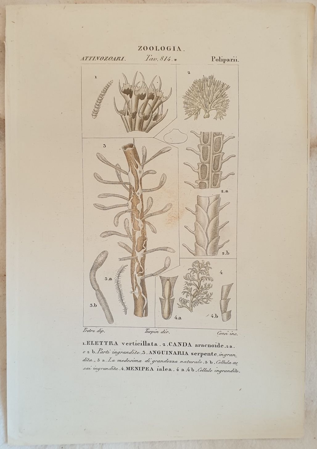 INCISIONE: Litografia con coloritura coeva all'acquarello AUTORE: Corsi su disegno di Pretre ATLANTE: Dizionario di scienze naturali, Firenze Battelli 1831 DIMENSIONI FOGLIO: cm 24,5x17 DIMENSIONI INCISIONE: cm 15x9 EPOCA: 1831 circa CONDIZIONI: buone condizioni. Quest'opera imponente era composta da 29 volumi ed era corredata da centinaia di incisioni che rappresentavano tutto il mondo animale e vegetale. L'opera deriva da un eccellente lavoro di luminari del XVIII secolo supportati dal Re francese Louis XV in seguito guidati dallo stesso Turpin, considerato al tempo il più grande incisore di botanica.<BR>La maggior parte delle incisioni sono firmate Turpin & Pretre.<BR>Carta bianchissima e resistente di ottima qualità. ENGRAVING: Lythograph with coeval colouring with acquarello painting AUTHOR: Corsi after Pretre ATLAS: Dizionario di scienze naturali, Firenze Battelli 1831 SIZE OF PAGE: cm 24,5x17 SIZE OF THE ENGRAVING: cm 15x9 PERIOD: 1831 circa CONDITIONS: good conditions. This imponent work was made up by 29 volumes and contained hundreds of engravings that represented all the plant and animal kingdom. This work derives from an excellent work of luminaries of the 18th century supported by the french King Louis XV and then directed by the same Turpin that was considered as the greatest botanical engraver of his time. The most of his engravings are signed Turpin & Pretre.<BR>Very white strong paper of good quality.