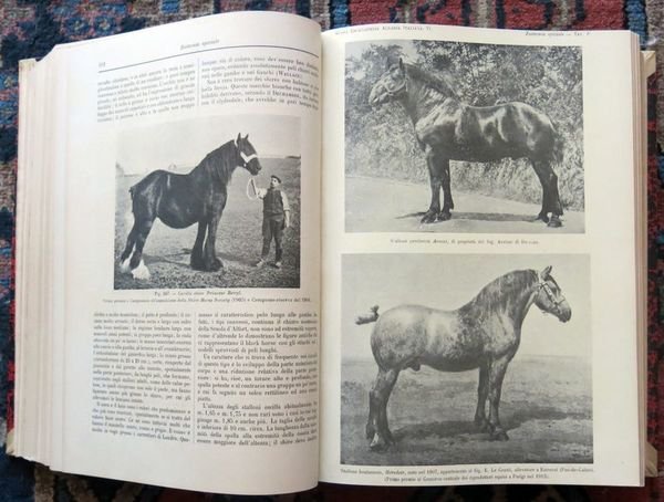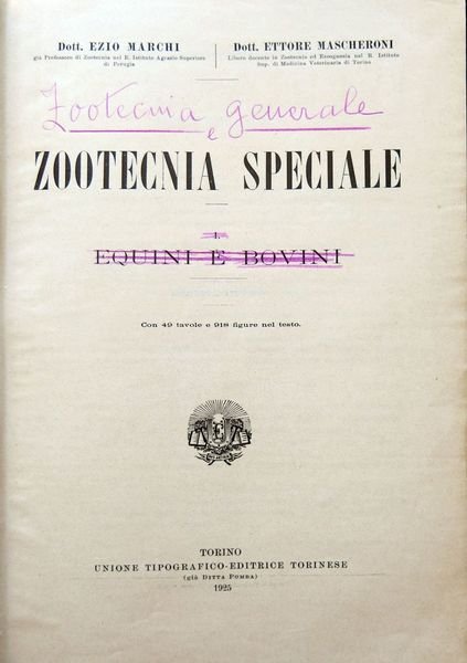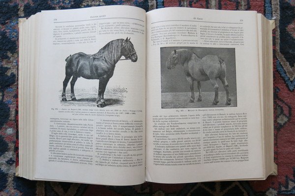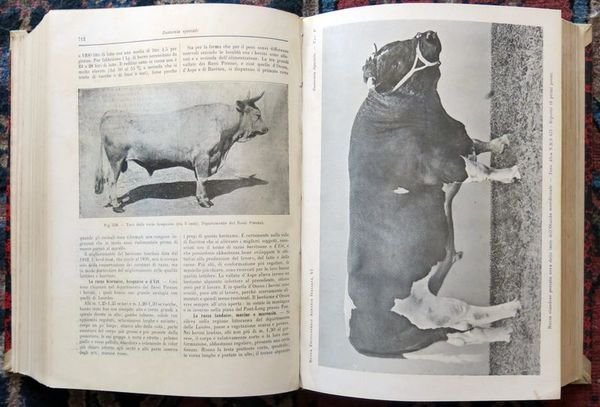 Nuova Enciclopedia Agraria Italiana in ordine Metodico. Redatta da Cultori delle Diverse Discipline Agrarie. Diretta dai Professori Dottore Vittorio Alpe, Ingegnere Mario Zecchini, Dottore Marco Soave. Unione Tipografico – Editrice Torinese (già Ditta Pomba), Torino, 1925. Con 49 tavole e 918 figure nel testo. In 4to, pp. 1106 (con Indice), ill. fot. in b/n n. t. e f. t. (queste, in numero di 25, sono anche a p. p., o in colore, o rip. come le due tavole illustranti le razze equine) + 22 tavole tonolitografiche in fine, raffiguranti decine di razze bovine, leg. edit. con piatti in cartonato marmorizz. in rosso / nero e dorso in pergamena con titolo su tassello in tela rossa. Al frontespizio una correzione al titolo in matita rosa, alcuni segni di studio alle prime pagine in matita blu, un minimo distaccamento del dorso visibile al solo contropiatto posteriore, esemplare in ottimo stato di conservazione.