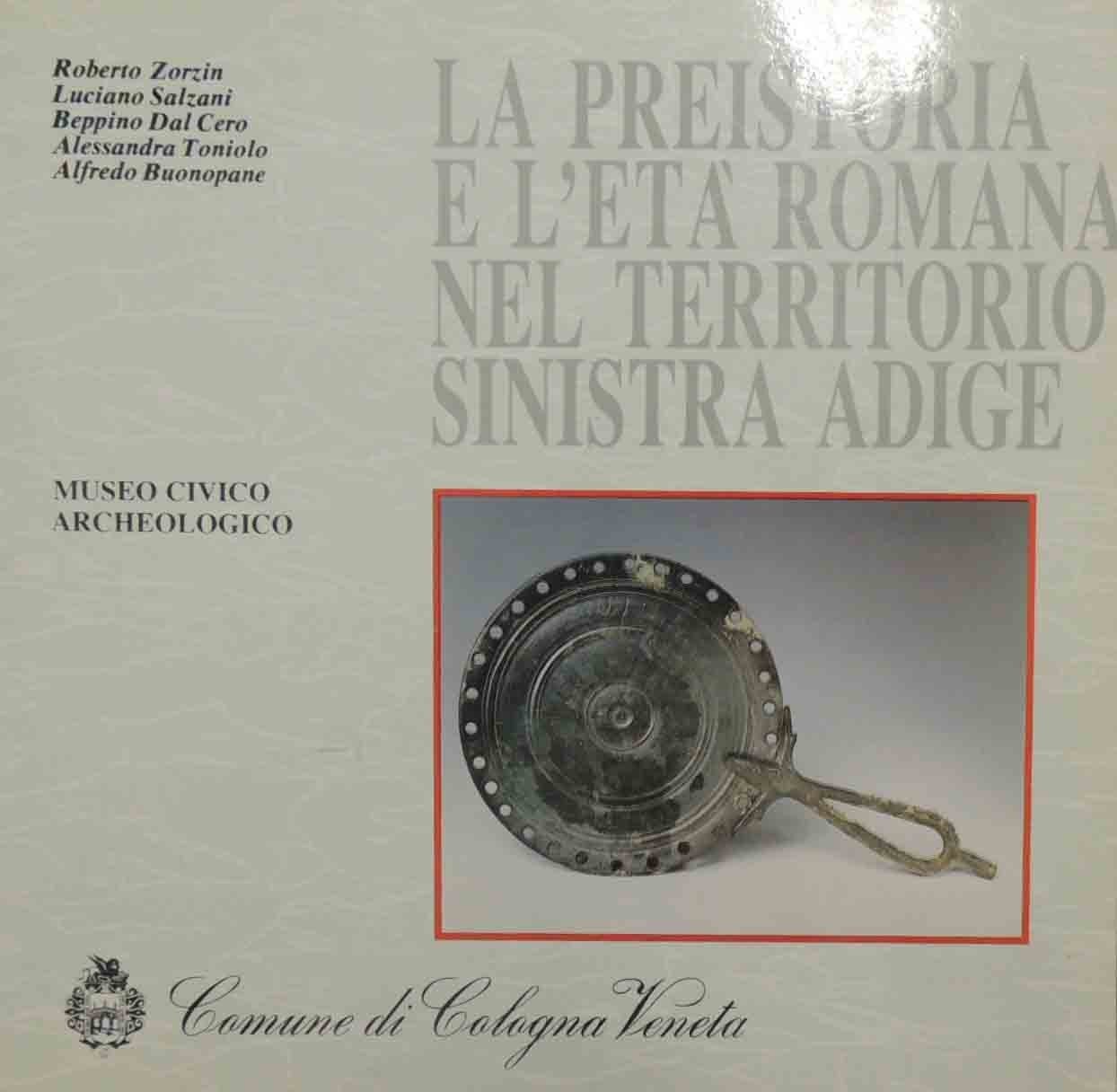 Roberto Zorzin et al., La preistoria e l’età romana nel territorio sinistra Adige, Comune di Cologna Veneta – Museo Civico Archeologico, s.l. (ma stampato a Cologna Veneta, presso l’Editrice L.G. Ambrosini e C.) 1990, pp. 101, ill. b.n. e col., cm 23x23, br. ed. Indice: Presentazione – Roberto Zorzin, Geologia e geomorfologia di una porzione di alta e media pianura veronese orientale – Luciano Salzani, Storia delle ricerche – Id., Profilo storico – Id., I siti preistorici e protostorici – Beppino Dal Cero, L’epoca romana – Id., I siti romani – Alfredo Buonpane, La collezione epigrafica del Museo Civico di Cologna Veneta – Alessandro Toniolo, Schede – Ringraziamenti. All’interno del volume, conservato articolo sul Museo Civico di Cologna Veneta dal titolo Con i suoi 102 anni è la più antica tra le esposizioni della provincia, autore Maurizio Brenzoni (estratto da s.n., s.d., ma probabilmente 1994). Minime tracce d’uso, per il resto perfetto.