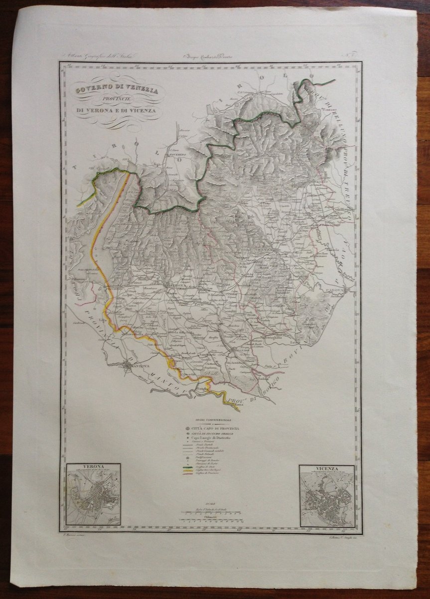 Stampa antica originale acquaforte, Governo di Venezia Provincie di Verona e di Vicenza tratto da ATLANTE GEOGRAFICO DEGLI STATI ITALIANI COROGRAFIA FISICA STORICA E STATISTICA DELL'ITALIA di Attilio Zuccagni - Orlandini Firenze,1840. Tecnica: incisione su rame all'acquaforte. Dimensioni: con margini bianchi cm 63.5x45. Note: in basso a sinistra timbro a secco dell'Editore; con pianta delle città Vicenza e Verona; confini con coloritura ad acquarello coeva. Condizioni di conservazione Ottima con ampi margini (vedi foto). NON TRATTIAMO RIPRODUZIONI OGGETTO ASSOLUTAMENTE ORIGINALE INCZC.0063 MT