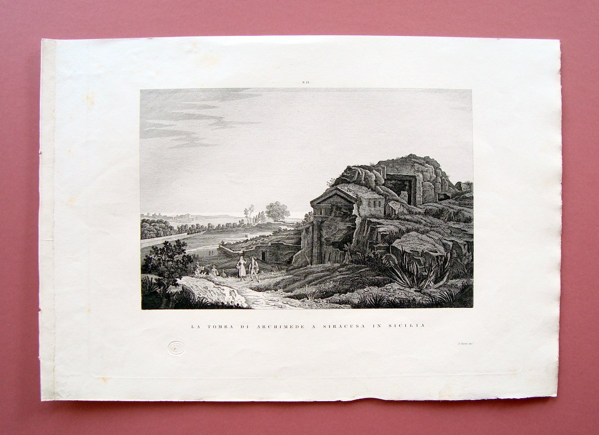Stampa antica originale acquaforte, La tomba di Archimede a Siracusa in Sicilia tratto da ATLANTE GEOGRAFICO DEGLI STATI ITALIANI COROGRAFIA FISICA STORICA E STATISTICA DELL'ITALIA di Attilio Zuccagni - Orlandini Firenze,1840. Tecnica: incisione su rame all'acquaforte. Dimensioni: con margini bianchi cm 32x46 Note: in basso a sinistra timbro a secco dell'Editore Condizioni di conservazione Ottime con ampi margini(vedi foto). NON TRATTIAMO RIPRODUZIONI OGGETTO ASSOLUTAMENTE ORIGINALE INCZC.0433 blu