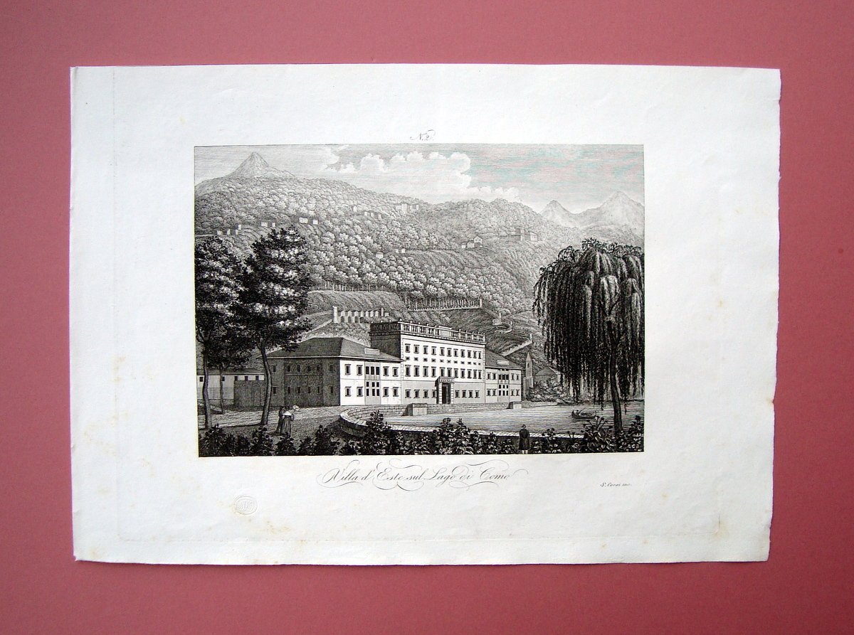 Stampa antica originale acquaforte, Villa d'Este sul Lago di Como tratto da ATLANTE GEOGRAFICO DEGLI STATI ITALIANI COROGRAFIA FISICA STORICA E STATISTICA DELL'ITALIA di Attilio Zuccagni - Orlandini Firenze,1840. Tecnica: incisione su rame all'acquaforte. Dimensioni: con margini bianchi cm 31,5x44,5 Note: in basso a sinistra timbro a secco dell'Editore Condizioni di conservazione Ottime con ampi margini; qualche leggero foxing,minime tracce d'uso (vedi foto). NON TRATTIAMO RIPRODUZIONI OGGETTO ASSOLUTAMENTE ORIGINALE INCZC.0297 blu