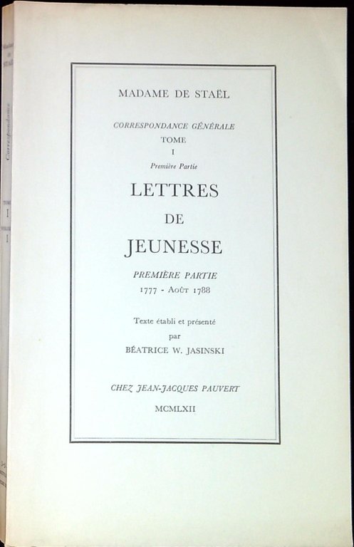 Madame de Staël 1.1: Lettres de jeunesse, 1777-Août 1788. Paris, Pauvert 1962, LXXXIII, 251 p. ; 22 cm. (60952)