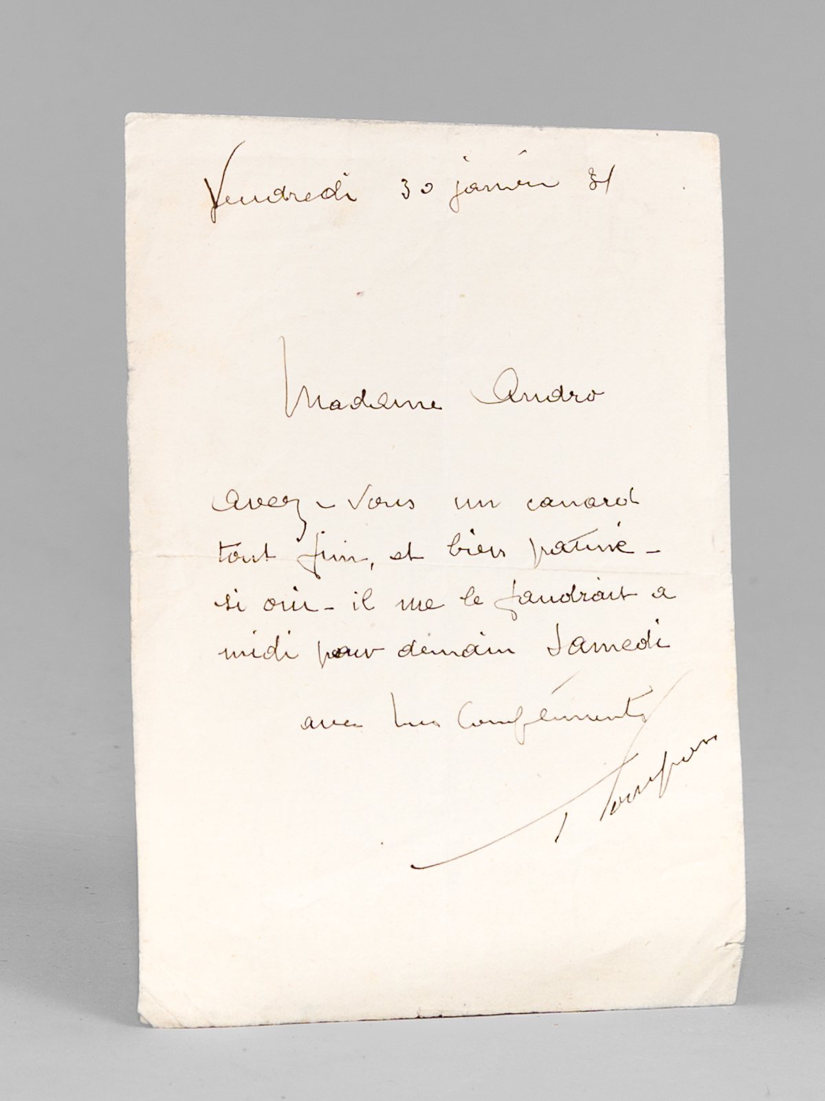 [ 1 lettre autographe signée, datée du 30 janvier 1931 : ] "Madame Andro, Avez-vous un canard tout fini et bien patiné - si oui - il me le faudrait à midi pour demain samedi. Avec mes compliments"