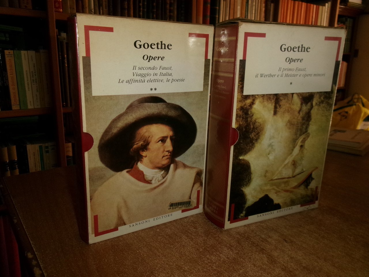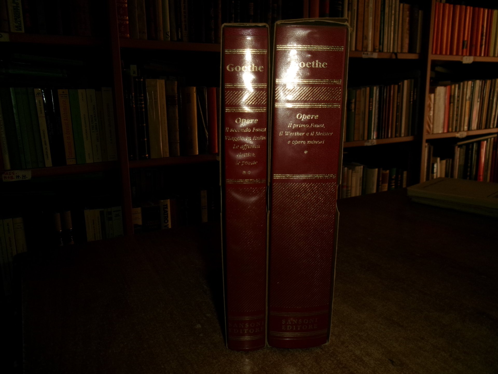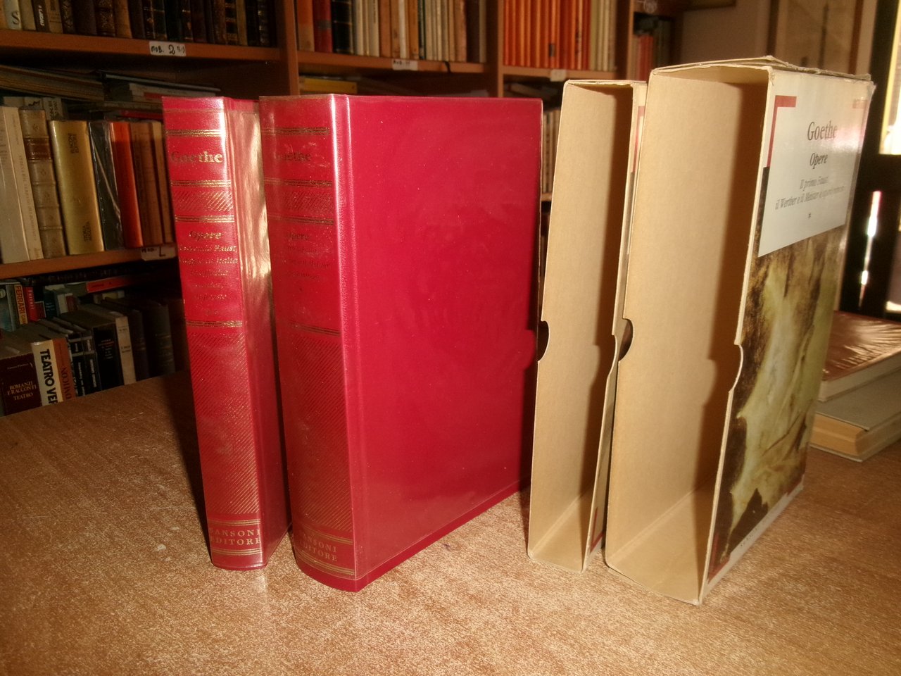 2 volumi - GOETHE Opere con introduzione e a cura di Vittorio Santoli con un saggio di Thomas Mann. Firenze, Sansoni Editore, 1989. 2 volumi in-8°, similpelle bordeaux con fregi e titoli in oro sui dorsi, sovracopertine in acetato. Il primo Faust, il Werther e il Meister e opere minori. Il secondo Faust Viaggio in Italia. Le Affinità elettive, le poesie. Complessive 1410 pp. Astucci con segni del tempo ma volumi ottimamente conservati con segnalibri in cotone. Neg. fot. mob. N