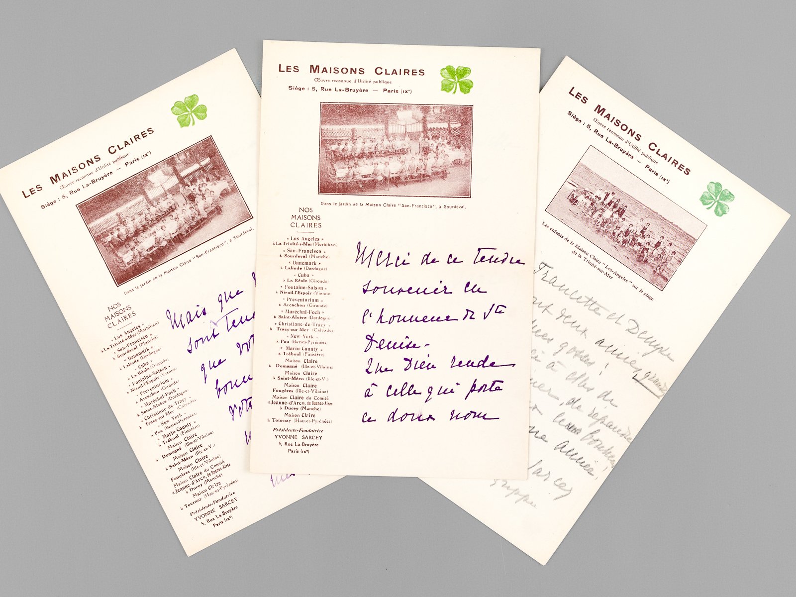 3 L.A.S. de une ou deux pages, sur papier à bel en-tête illustré de l'Oeuvre reconnue d'Utilité Publique "Les Maisons Claires", Siège : 5 rue La Bruyère, Paris, s.d., [ vers 1917-1925 ] [ 3 lettres autographes signées de remerciements pour l'oeuvre "Les Maisons Claires" ] "Mais que vos 25 ans sont tendres et que votre lettre est bonne et généreuse. Votre mari doit être un homme heureux, et grâce à vous, mes gosses seront des enfants heureux [. ]" - "Merci de ce tendre souvenir en l'honneur de Ste Denise. Que Dieu rende à celle qui porte ce doux nom le bonheur qu'elle donne à mes petits ! [. ]" - "Francette et Denyse sont deux amies généreuses, amies de mes gosses ! Merci à elles de les aimer, de répandre sur eux leur bonheur et Bonne Année ! [.]" Présidée par Yvonne Sarcey (1869-1950) l’œuvre dite des « Maison Claires » fut fondée le 8 juin 1917. Les enfants habitant en des lieux malsains et insalubres sont accueillis dans les Maisons Claires entre trois et douze mois ; on y récupère notamment les enfants des soldats pauvres morts pour la patrie. On peut lire sur chaque lettre la liste imprimée de 14 "Maisons" situées sur tout le territoire. Bon ensemble.