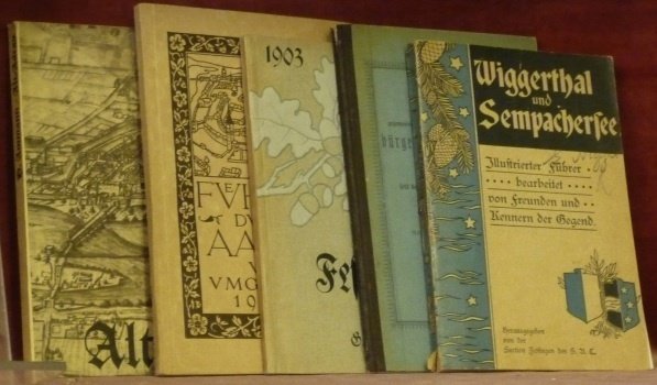 5 Heften über Kantons AARGAU. - Wiggerthal und Sempachersee. Illustrierter Führer. Zofingen, 1900, 213S. - Die Stammregister der gegenwärtigen und diesem Jahrhundert ausgestorbenen bürgerlichen Geschlechter der Stadt Zofingen. 1896, 92 S. - Fischer - Aargauische Centenarfeier. Festspiel. 1903. 88S. - Führer durch Aarau und Umgebung. 1923. 92 S. - Ammann - Alt Aarau. 1944. 140 S.