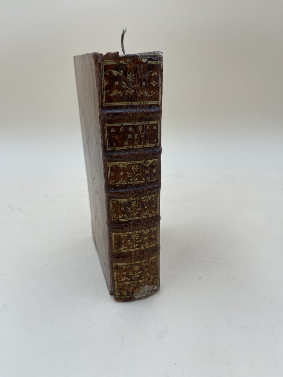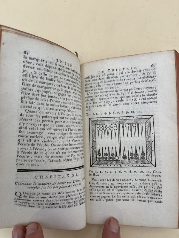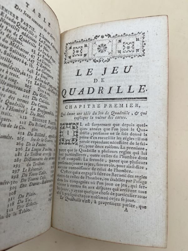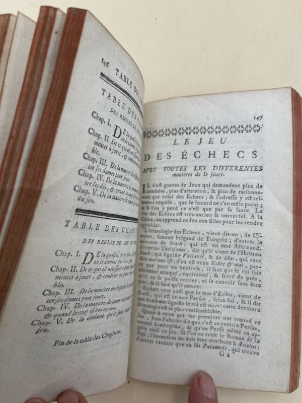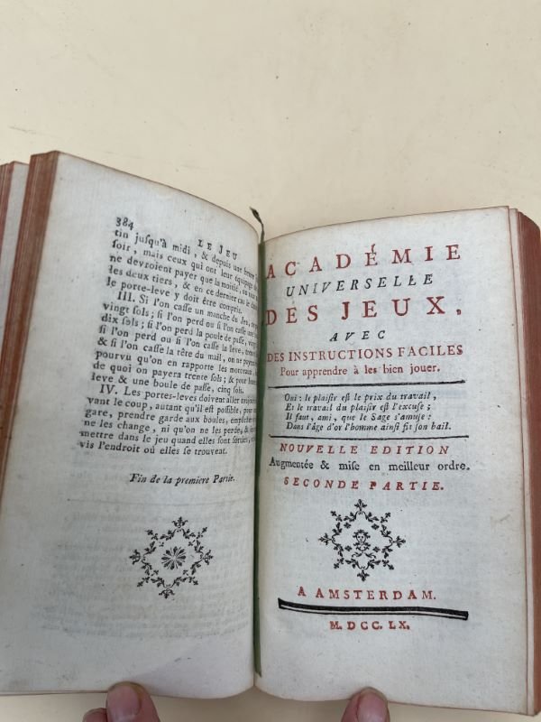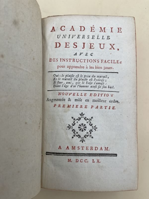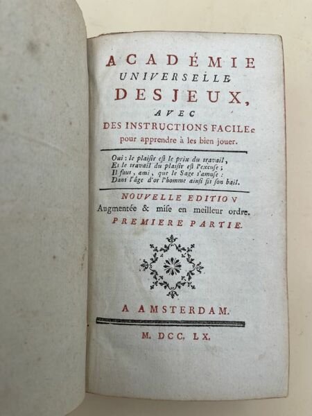 A Amsterdam sans nom 1760 A Amsterdam, 1760. 2 parties reliées en un seul volume fort In-12 plein veau, dos à nerfs très orné. 384 + 294 pages. Figures dans le texte. Nouvelle édition augmentée & mise en meilleur ordre. La 1ere partie contient également "Les règles du médiateur recueillies et expliquées pour l'utilité du beau sexe et des personnes qui n'ont aucune notion de ce jeu" (jeu de carte). La 2eme contient , entre autres, le jeu des echecs. Petit défaut à la coiffe et un manque de cuir en queue. Intérieur en bon état. Bon exemplaire.