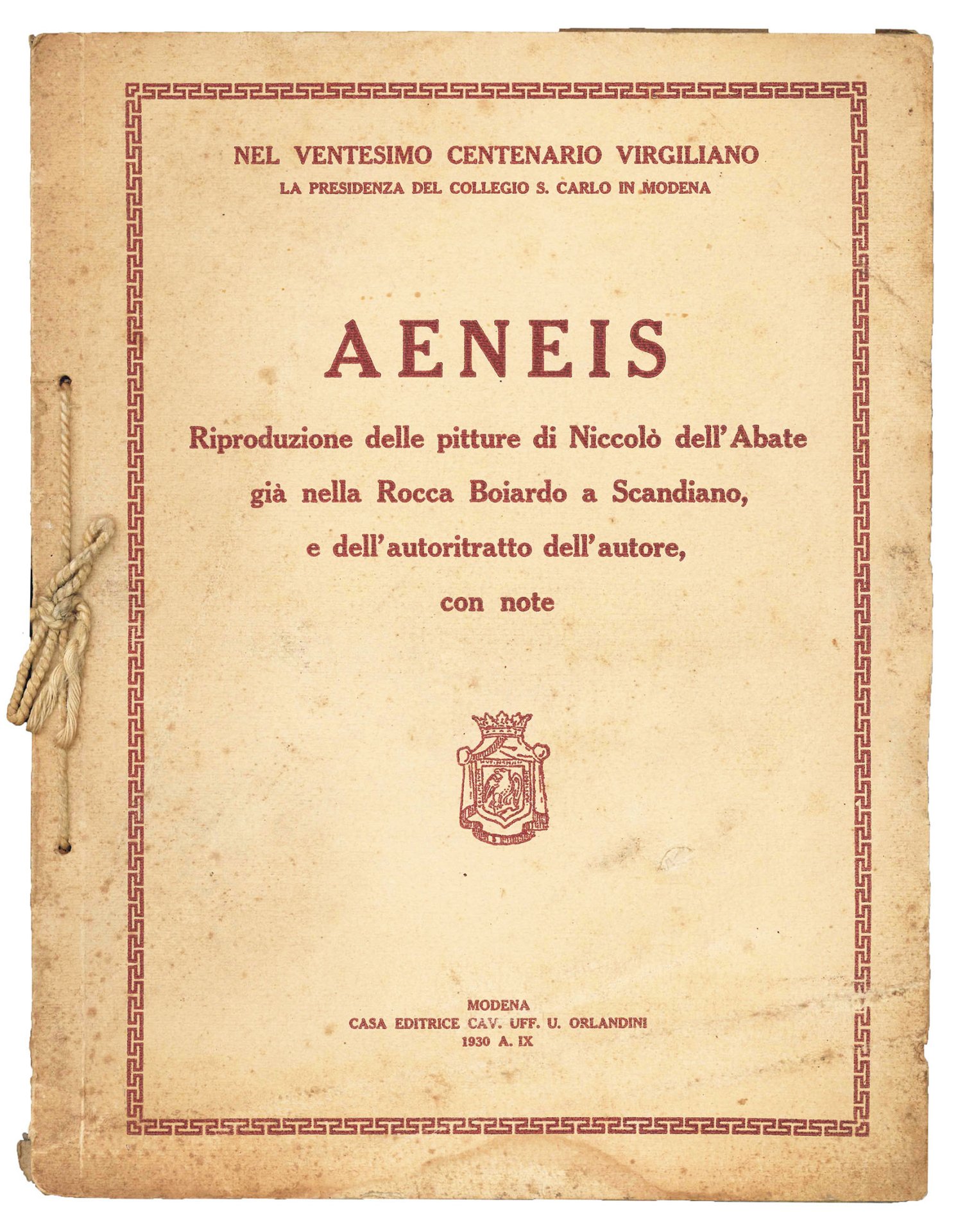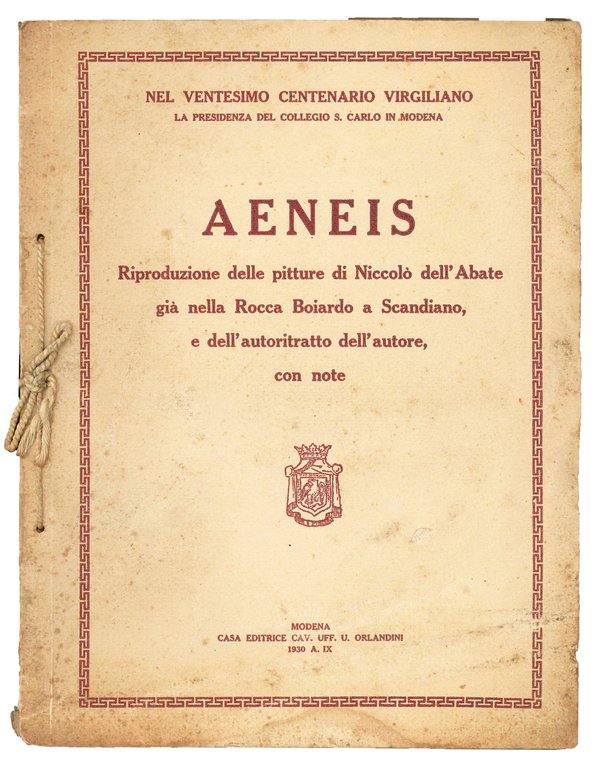 Mm. 333x250. Pp. 14, XII cc. di tavv. in b/n f.t., [1] c. di tav. con ritratto dell'artista. Cartonato editoriale legato con cordino (cop. lievemente brunite, margini lievemente consunti). Prima edizione, pubblicata dalla presidenza del Collegio S. Carlo in Modena in occasione del ventesimo centenario virgiliano.