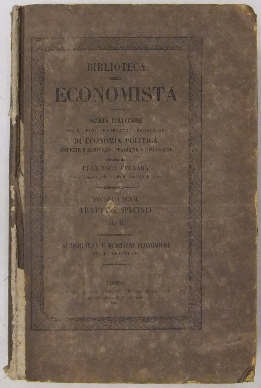 Agricoltura e quistioni economiche che la riguardano. Opuscoli sull'agricoltura francese (Cochut, Lavergne, Dupuinode, Stolipine, Thornton, Bastiat, Woloski, Tracy). La proprietà fondiaria e le popolazioni agricole in Lombardia (Jacini). Opuscoli sull'agricoltura toscana (De Sismondi, Landucci, Capponi, Capei, Ridolfi, Lambruschini, Gasparin). Opuscoli sull'agricoltura romana (De Sismondi, Vernouillet). Sul prezzo del grano (De Thunen, Ricardo). Introduzione di Francesco Ferrara