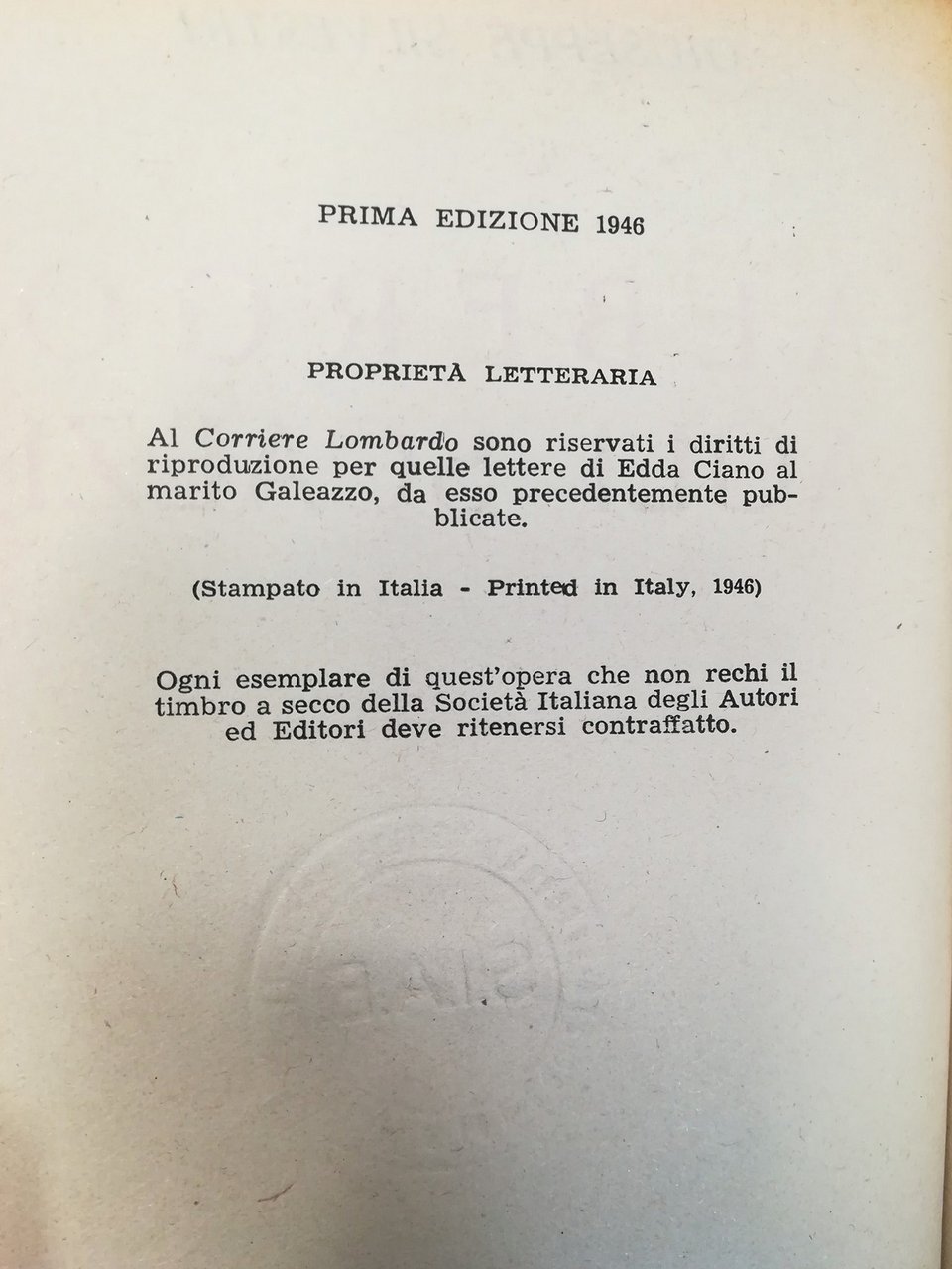 Prima edizione - Brossura originale entro legatura artigianale in mezza pelle, titolo e fregio in oro al dorso, piatti marmorizzati, 263 pagine con tavole in nero fuori testo, nastrino segnapagine. Conservati i piatti originali. Cronaca romanzata della prigionia di Galeazzo Ciano e dei suoi compagni, rinchiusi in un vecchio convento veronese trasformato in carcere. Lievi abrasioni alle nervature e ai margini del dorso, peraltro esemplare in ottime condizioni.