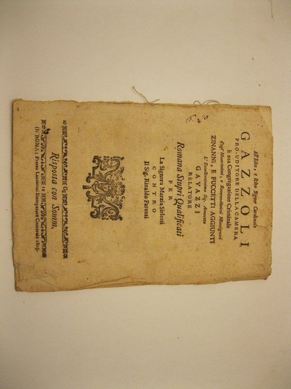 All'ill.mo e r.mo Signor Cardinale Gazzoli pro uditore della camera e sua congregazione criminale. Cogl'Illustrissimi e Reverendissimi Monsignori Zinanni e Puccetti aggiunti l'Eccellentissimo Sig. Avvocato Gavazzi relatore romana stupri qualificati per la Signora Marzia Sirletti contro il Sig. Rinaldo Parenti. Risposta con sommario