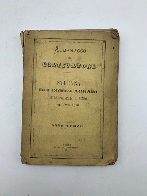 In 16 (cm 12 x 17,5), pp. 288 con illustrazione in xilografia al piatto posteriore. Gora leggera al piatto anteriore. Strappo riparato a due fogli interni con le pp. 47-48-49-50. Brossura editoriale. "Contrariamente alla miriade d'almanacchi che si pubblicano annualmente, e che non hanno altro pregio che di accrescere lamole della carta stampata, questo invece e' un vero gioiello d'agricoltura e d'economia rurale; e l'utilita' non va disgiunta al diletto" ("Il progresso rivista delle nuove invenzioni e scoperte"). Fra i contributi presenti: Calendario del vignaiuolo; I guastamestieri e l'agricoltura; Istruzioni relative al miglioramento delle abitazioni rurali; Sull'assistenza dei poveri delle campagne; Sulle macchine a vapore; Il picco produttore di carne; Inno del fanciullo appena desto; Mercato dei bozzoli dell'anno 1875; Sulla concimazione della canapa; Sullo scortecciamento delle viti annose; Il vino italiano nel 1875; Notizie economico-statistiche-idrografiche della Provincia di Cuneo; Abuso delle bevande spiritose e sue conseguenze; Chi pianta d'autunno guadagna un anno; ecc...