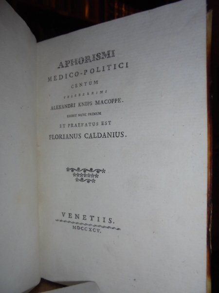 Aphorismi medico-politici centum celeberrimi Alexandri Knips Macoppe. Venetiis, MDCCXCV. In 8° , pergamena coeva. LXII pp. Edit nunc primum et praefatus est Florianus Caldanius. ( Pergamena coeva con lieve bruciatura all' unghia). Bell' esemplare. Neg.
