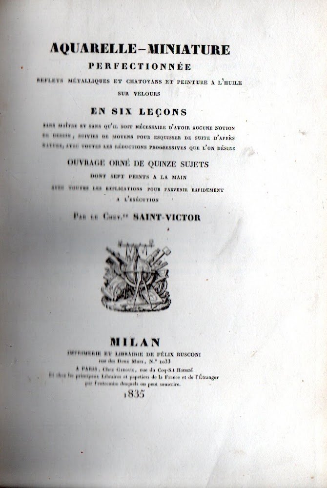 Aquarelle-miniature perfectionnée, reflets métalliques et chatoyans et peinture a l'huile sur velours en six lecons : sans maitre et sans qu'il soit nécessaire d'avoir aucune notion de dessin, suivies de moyens pour esquisser de suite d'aprés nature, avec toutes les réductions progressives que l'on désire : ouvrage orné de quinze sujets dont sept peints à la main avec toutes les explications pour parvenir rapidement a l'exécution | Libri antichi e moderni | Saint-Victor, Chevalier, ,Saint-Victor, Chevalier