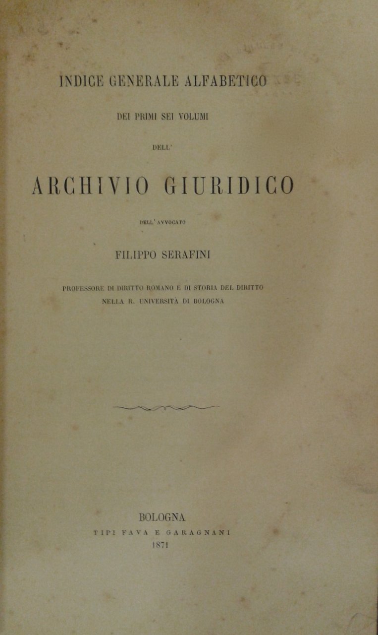 Archivio Giuridico. Diretto da Filippo Serafini. Indice generale alfabetico dei primi 6 volumi | Libri antichi e moderni | Autori Vari