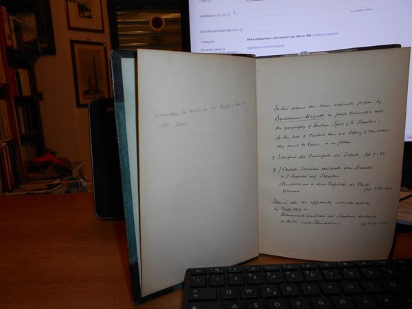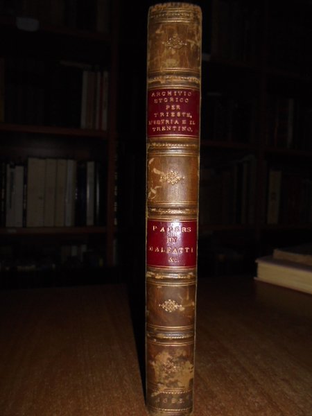 (Venezia Giulia e Tridentina) ARCHIVIO Storico per Trieste, l' Istria e il Trentino diretto da S. Morpurgo ed A. Zenatti . Volume primo. Roma, Direz. Proprietaria Editrice, 1881-82. In-8°, m. pelle con angoli, dorso a nervi con due tasselli. vii, (1), 416 pp. con 3 tavole f.t. Questo volume è interessante per diversi scritti di storia, arte, folklore, letteratura di illustri studiosi: Malfatti, Orsi, Monaci, Morpurgo, Novati, Lenatti, Cipolla, Renier, Bertolatti, ecc. Ex libris Thomas Hodkin. In ottimo stato di conservazione. Manoscritto alla prima bianca. Neg. mob. 2