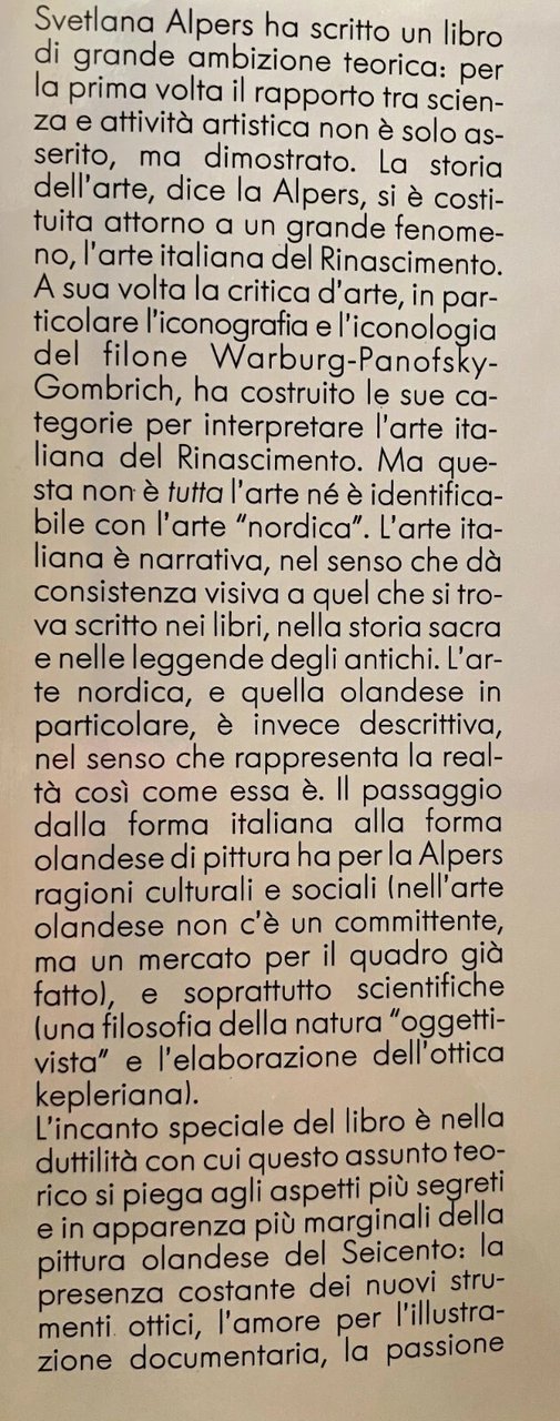 Svetlana Alpers ha scritto un libro di grande ambizione teorica: per la prima volta il rapporto tra scienza e attività artistica non è solo asserito, ma dimostrato. La storia dell'arte, dice la Alpers, si è costituita attorno a un grande fenomeno, l'arte italiana del Rinascimento. A sua volta la critica d'arte, in particolare l'iconografia e l'iconologia del filone Warburg-Panofsky-Gombrich, ha costruito le sue categorie per interpretare l'arte italiana del Rinascimento. Ma questa non è tutta l'arte né è identificabile con l'arte nordica. L'arte italiana è narrativa, nel senso che dà consistenza visiva a quel che si trova scritto nei libri, nella storia sacra e nelle leggende degli antichi. l'arte nordica, e quella olandese in particolare, è invece descrittiva, nel senso che rappresenta la realtà cosi come essa è. Il passaggio dalla forma italiana alla forma olandese di pittura ha per la Alpers ragioni culturali e sociali (nell'arte olandese non c'è un committente, ma un mercato per il quadro già fatto), e soprattutto scientistiche (una filosofia della natura oggettivista e l'elaborazione dell'ottica kepleriana).
