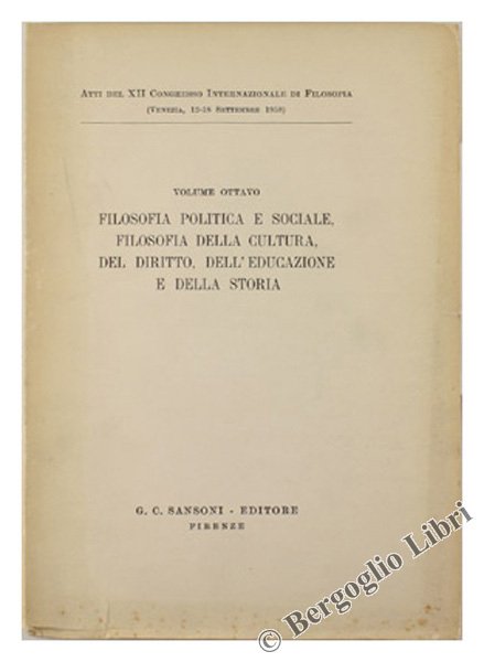 Atti del XII Congresso Internazionale di Filosofia (Venezia, 12-18 Settembre 1958). Volume VIII : FILOSOFIA POLITICA E SOCIALE, FILOSOFIA DELLA CULTURA, DEL DIRITTO, DELL'EDUCAZIONE E DELLA STORIA. | Libri antichi e moderni | Autori Vari.