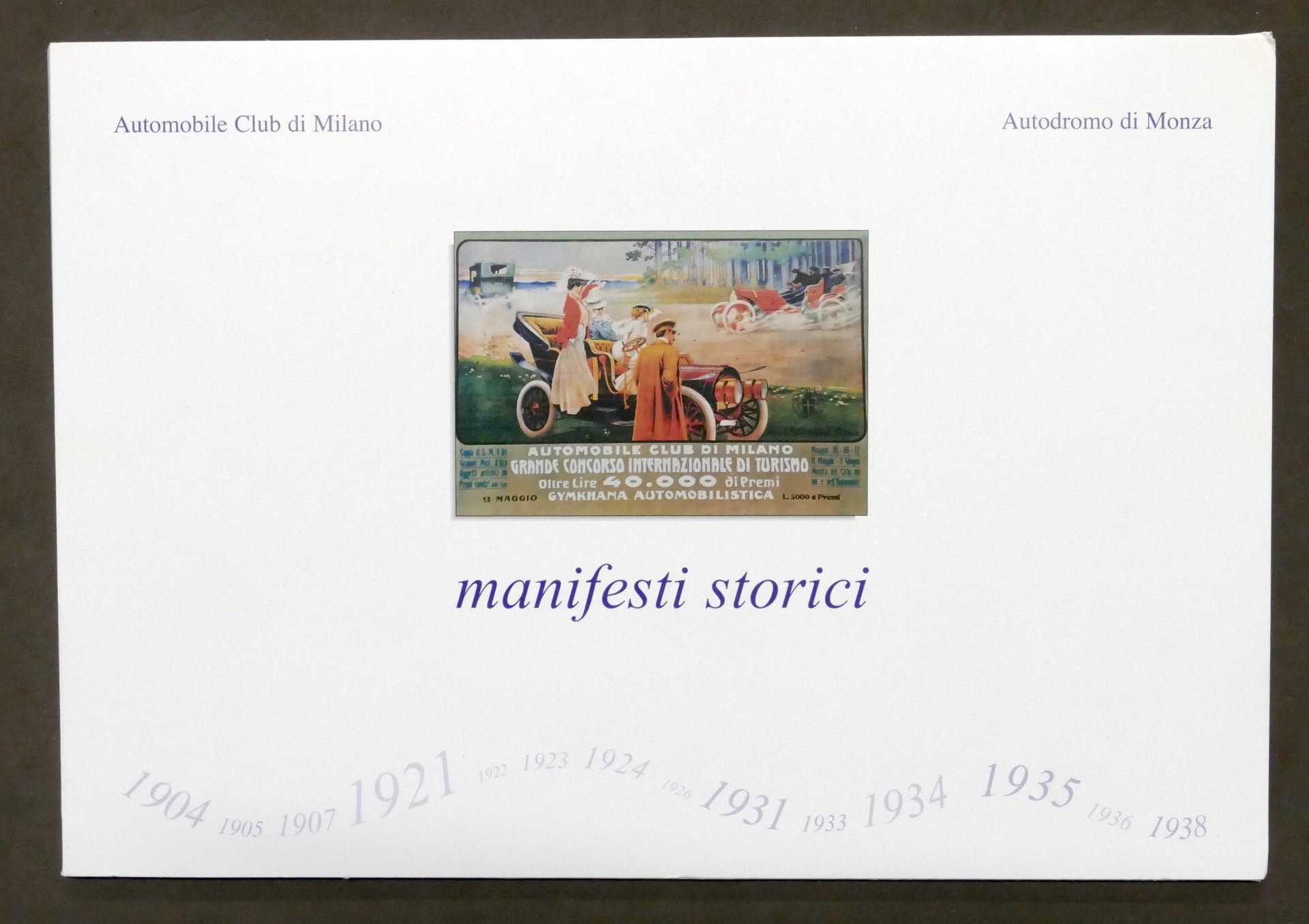 Manifesti storici dell'Automobile Club Di Milano e dell'Autodromo di Monza realizzati tra il 1904 e il 1938 - ed. 2007Cartelletta in cartonato contenente 16 tavole illustrate (22 x 32 cm cad.) Condizioni generali molto buone.