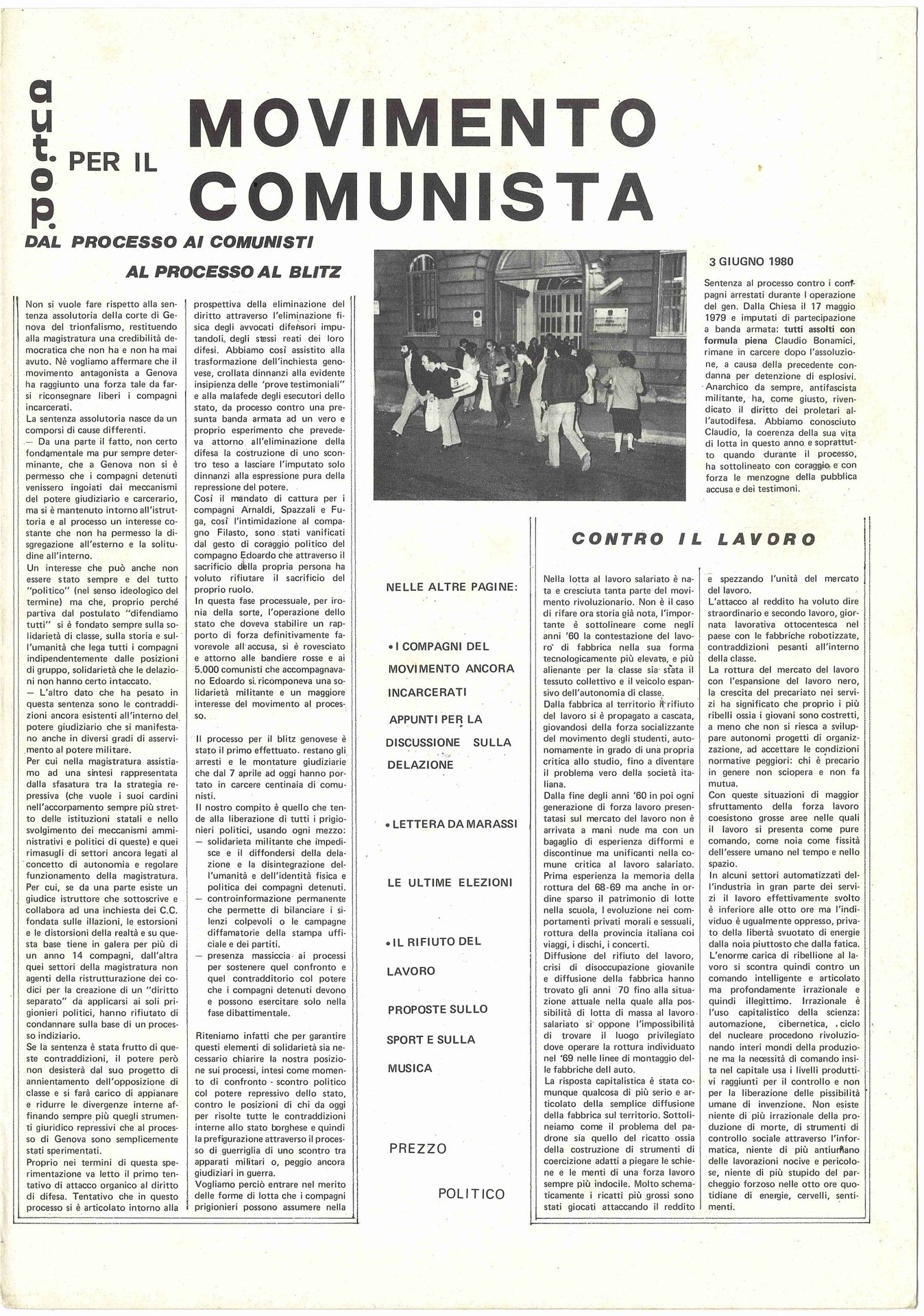 Giornale redatto in gran parte dai compagni del Comitato dell'Autonomia Operaia di Sampierdarena – C.A.S.- dopo la conclusione (3 giugno 1980) del processo agli arrestati del "blitz" di Dalla Chiesa il 17 maggio 1979. Il generale ravvedeva nuclei terroristici in tutta la sinistra extraparlamentare e nelle classi colte che rappresentavano un minaccioso potenziale di dissenso. Foglio giornale stampato in b/n, direttore responsabile Marcello Baraghini, supplemento a Stampa Alternativa, in ottimo stato