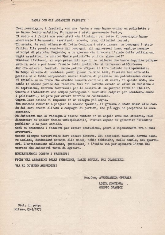 Basta con gli assassini fascisti! Volantino | Libri antichi e moderni | Avanguardia Operaia, Lotta Continua, Gruppo Gramsci