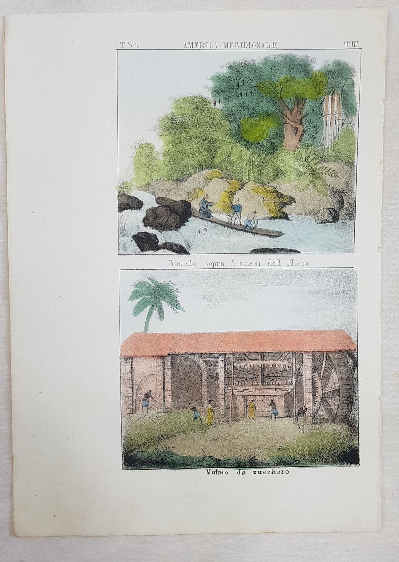 Bella veduta del 1840 circa che mostra una canoa sul fiume Ilheos in Brasile e un mulino per lo zucchero. In buone condizioni. ATLANTE: Galleria Universale di tutti I popoli del mondo TECNICA: acquaforte acquarellata a mano DIMENSIONI FOGLIO: 27,5x19,5 cm DIMENSIONI INCISIONE: 22x13 cm EPOCA: 1840 circa CONDIZIONI: Buone. Alcune fioriture. Beautiful print of 1840 circa featuring a canoa upon stones of Ilheos in Brazil and a sugar mill. Date: 1840 circa Atlas: Galleria Universale di tutti I popoli del mondo Technique: etching coloured by hand with aquarello Leaf Dimension: 27,5x19,5 cm (10.8x7.7 inches) Engraving Dimension: 22x13 cm (8.7x5.1 inches) Conditions: Good conditions. Some foxings and worn edge