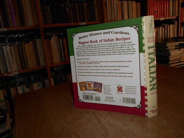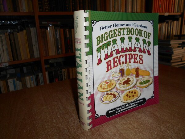 Better Homes and Gardens Biggest Book of Italian Recipes: More Than 350 All-Time Favorites and Authentic Dishes. In-8°, cartoncino edit. ill. a col. con spirale di plastica. 415 pp. con numerose ricette con testo in inglese. Uff. stanzetta mob. sinistra II - 5 carc.