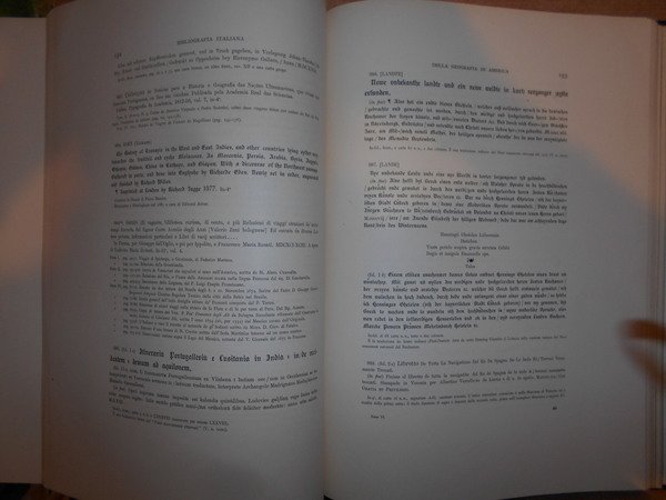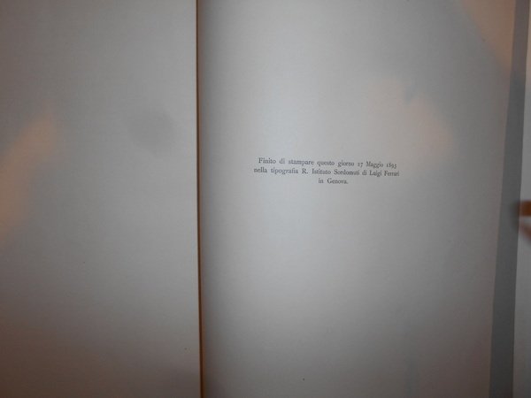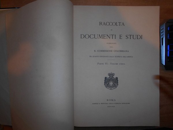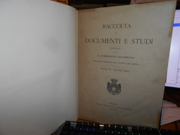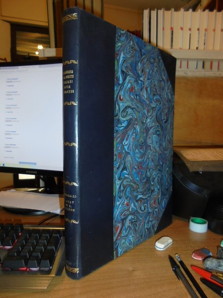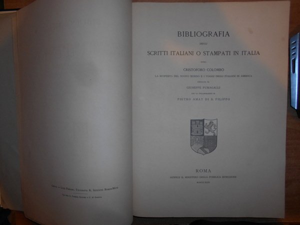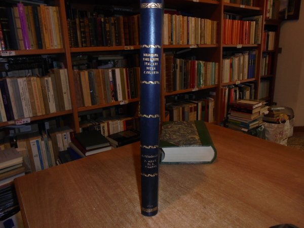 Giuseppe Fumagalli. Roma, Auspice il Ministero della Pubblica Istruzione, (Genova Luigi Ferrari, Tipografia R. Istituto Sordo-Muti), MDCCCXCIII. BIBLIOGRAFIA degli SCRITTI ITALIANI o STAMPATI in Italia sopra Cristoforo Colombo. La scoperta del Nuovo Mondo e i viaggi degli italiani in America. Con la collaborazione di Pietro Amat di S. Filippo. In-folio, m. pelle con larghe punte titolo e fregi in oro al dorso, copertine originali conservate. XX, 217 pp. stampato su carta forte. Ottimo esemplare in bella legatura con le brossure originali conservate. Uff. stanzetta a sinistra mob. in basso.
