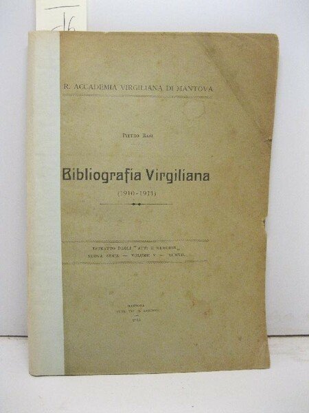 In 8, pp. 128. Dedica autogr. dell'A. a p. 1. P. ant. originale in br. presente, p. post. assente, rinforzo al dorso. Bibliografia ragionata dei titoli virgiliani usciti nel biennio 1910-1911.