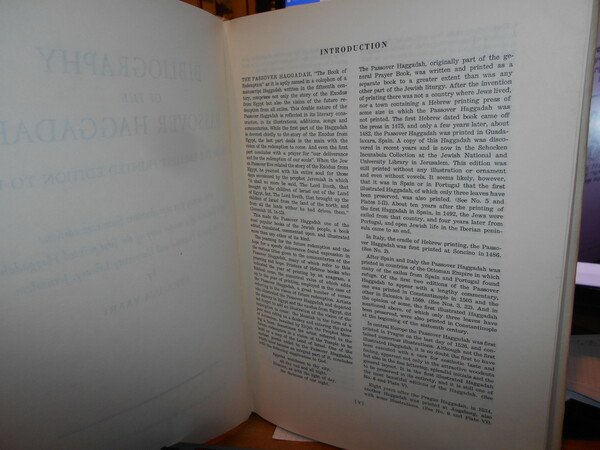 Bibliography of the Passover Haggadah From the Earliest Printed Edition to 1960, with Twenty Five Reproductions from Rare Editions and a Facsimile of a Unique Copy of the First Printed Haggadah in the Jewish National and University Library, Jerusalem. In-folio, tela con titolo in oro entro tassello al dorso, sovracopertina. 208 pp. con numerosi facsimili in tavole fuori testo. Teto iglese/ebraico. Sovracopertina con lievi segni d' uso ma libro come nuovo. E - I - 7 - 2