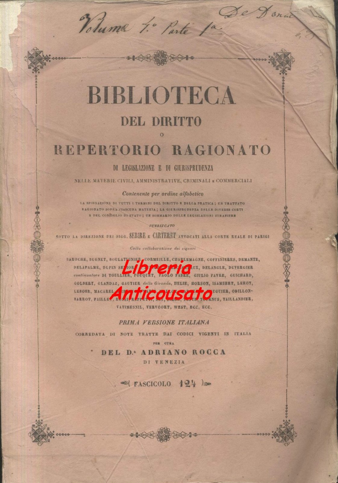 BIBLIOTECA DEL DIRITTO O REPERTORIO RAGIONATO Volume 4 parte I 1855 libro antico