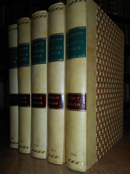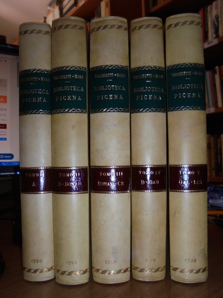 Filippo, Vecchietti. Moro. Osimo presso Domenicantonio Quercetti, 1790 - 1796. BIBLIOTECA PICENA O SIA NOTIZIE ISTORICHE DELLE OPERE E DEGLI SCRITTORI PICENI. 5 volumi in-4°, bella legatura in m.pergamena con piccoli angoli, fregi e titoli in oro ai dorsi. XL, 296; VII, 312; VII, 340; VII, 296; VIII, 303 pp. Rara opera che si ferma al V tomo (tutto il pubblicato). Bell' esemplare. Neg. nat. mob. 0