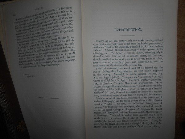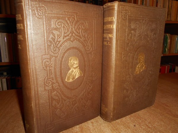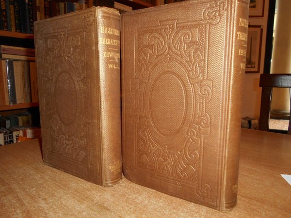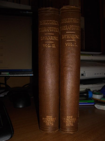 By EDWARD, JOHN WARING, M.D. London, The New Sydenham Society, 1878 - 1879. BIBLIOTHECA THERAPEUTICA or BIBLIOGRAPHY of THERAPEUCTIS, chiefly in reference to articles of the materia medica. 2 volumi in-8°, tela originale con fregi e titolo in oro e impressioni a secco sui piani, tagli rossi. xiv, vi, complessive 933, (1) pp. Ottimi esemplari. Uff. D - II - 5