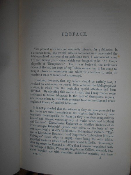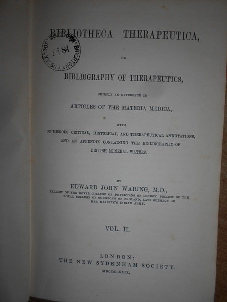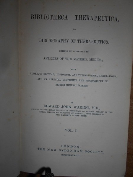 BIBLIOTHECA THERAPEUTICA or BIBLIOGRAPHY of THERAPEUCTIS, chiefly in reference to articles of the materia medica. | Libri antichi e moderni | By Edward, John Waring, M.D.