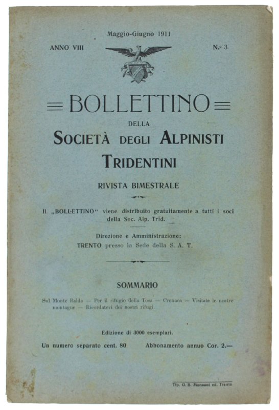 BOLLETTINO. Anno VIII - N.3, Maggio-Giugno 1911. | Libri antichi e moderni | Società Degli Alpinisti Tridentini.