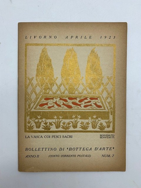 In 16 (cm 12 x 16,5), pp. (16) copertine comprese con 12 riproduzioni fotografiche su tavole fuori testo in carta patinata. Brossura editoriale con xilografia oro e rosso di Benvenuto Benvenuti al piatto anteriore. Numero del Bollettino della Bottega d'Arte dedicato alla mostra di primavera. Fra gli artisti presenti: Antonio Mancini, Plinio Nomellini, Alfonso Hollaender, Ettore Di Giorgio, Cesare Ciani, Ruggero Panerai, Ruggero Focardi, Cornelio Palmerini, Adolfo Wildt, e altri. La Bottega d'Arte nacque nel 1922, in via Indipendenza, grazie allo spirito di iniziativa di quattro imprenditori livornesi: Gustavo Mors, Dino Masini, Gino Belforte e Alvaro Angiolini. Gustavo Mors gestiva un laboratorio di cornici e colori, dove sostavano gli artisti livornesi, Fattori compreso. Mors comincio' ad aiutare i pittori labronici non solo a creare (mettendo loro a disposizione il laboratorio) ma anche a vendere i loro quadri, creando cosi' una vera e propria Bottega d'Arte. Alla Bottega d'Arte si riunivano i soci del Gruppo Labronico, alla cui presidenza si sono alternati Ulvi Liegi, Nomellini, Gino Romiti, Carlo Borgiotti, Renato Natali ed altri.