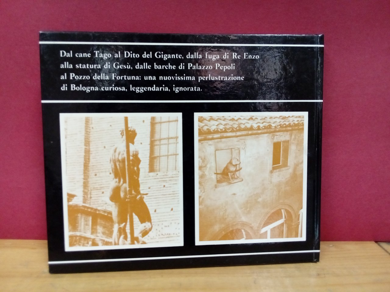 In – 8vo oblungo, legatura editoriale illustrata, pp. 161 ( 7 ). Ristampa riveduta della prima edizione. Completamente illustrato da foto in nero. Dall'indice: Curiosità diverse ; Formelle, stemmi, iscrizioni, insegne ; Illusionismo ottico ; Disarmonie ; Le acque ; Le mura ; Le torri ; Piazza Santo Stefano ; Piazza della Mercanzia ; Vestigia bentivolesche ; Ricordi bellici.