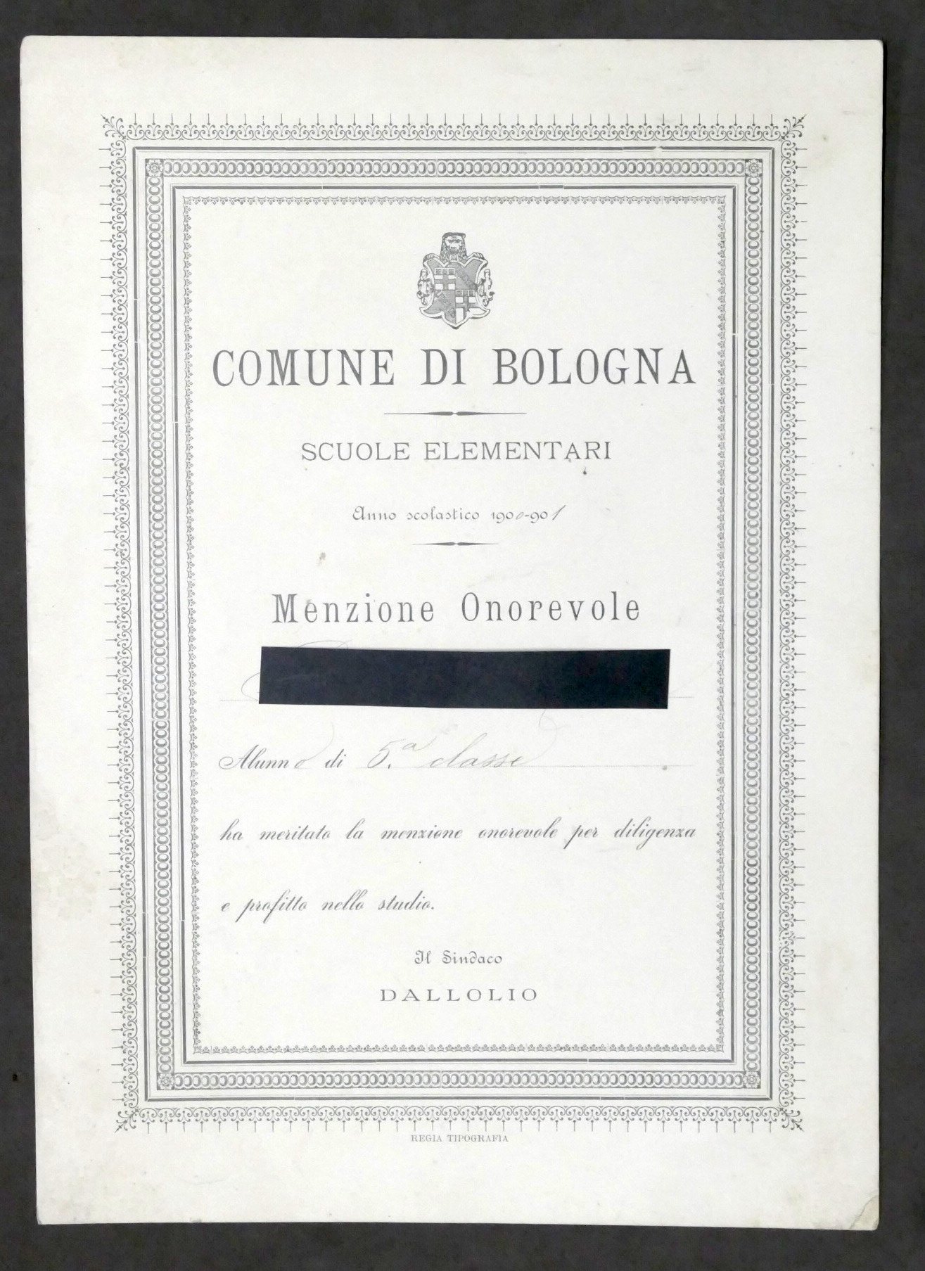Comune di Bologna - Scuole Elementari - Diploma di Menzione Onorevole - Anno 1900 / 1901 - Alluno di 5^ Classe Dimensioni: 21 x 30 cm ca. Buone condizioni generali.