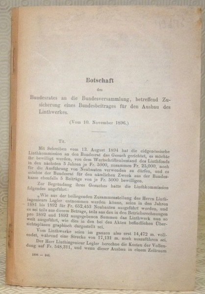 Botschaft des Bundesrates an die Bundesversammlung, betrefend Zusicherung eines Bundesbeitrages für den Ausbau des Linthwerkes (Vom 10.November 1896.) | Libri antichi e moderni |