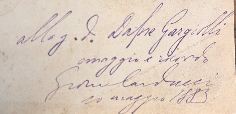>in-8, pp. 60, (4); 318, (10).Legatura in tela con tassello al dorso, brossura posteriore della prima opera conservata. Sono presenti entrambi i piatti della brossura della seconda opera. Edizione originale di entrambe le opere. L'esemplare presenta due dediche dell'autore a  Dafne Gargiolli, moglie di Carlo Gargiolli, grande amico del Carducci.