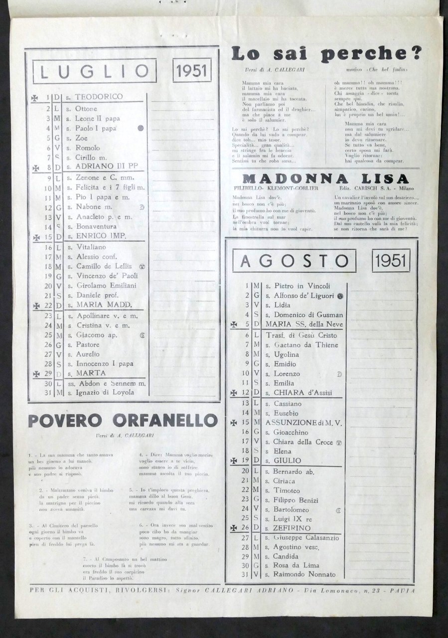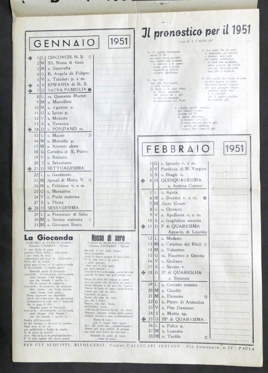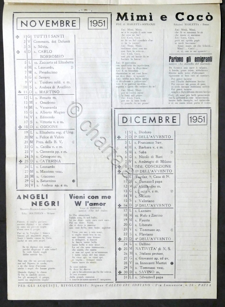 Calendario Canzoniere 1951 - Supplemento al Giornalissimo della Canzone