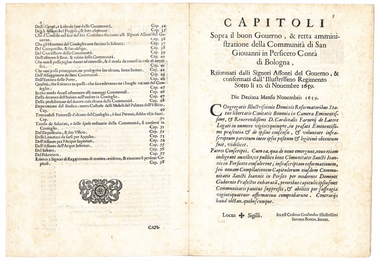 Apparently unrecorded edition of the statutes of San Giovanni in Persiceto, a small town in the bishopric of Bologna. The new statutes were issued on 10 November 1659 as Girolamo Farnese was inaugurated as the new cardinal legate of Bologna. They are devided into 58 chapters regulating all political and administrative aspects of the local government.