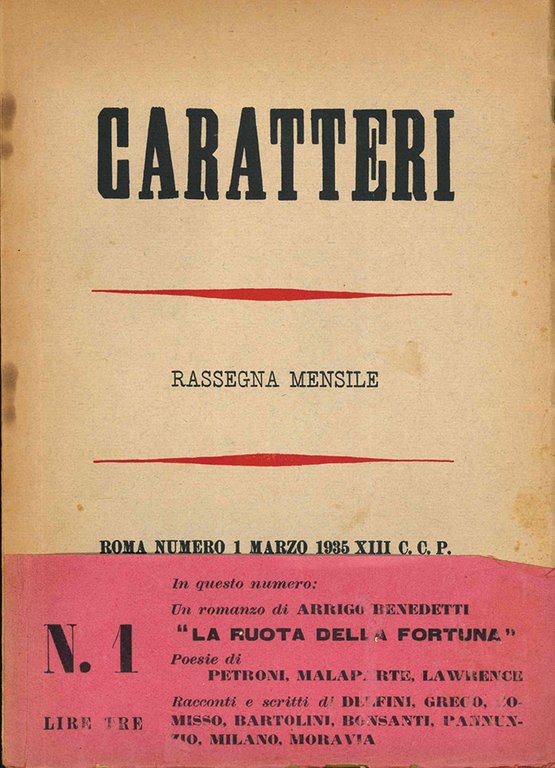 PERIODICOEdizione originale di tutto il pubblicato Fascicoli in stato più che buono.Fondata e diretta da Antonio Delfini e Mario Pannunzio nel marzo 1935, «Caratteri. Rassegna mensile» uscì nel marzo 1935 per poi continuare fino al numero 4 del giugno-luglio dello stesso anno. Molti i contributi e i nomi importanti - a partire da Alberto Moravia -, come è facile evincere osservando l’indice del primo numero in cui compaiono, tra gli altri, Malaparte con «Quattro liriche»; Moravia con una traduzione di poesie di Lawrence e con «Aragon e il documentario», Luigi Bartolini con «Diario e ragionamenti vari». Nel secondo numero, di nuovo Moravia («La tempesta» e Bartolini (con una raccolta di liriche) insieme a Mario Soldati e Alessandro Bonsanti. Nel terzo, si segnalano invece Umberto Saba con «Dopo la giovinezza», Tommaso Landolfi con «La morte del Re di Francia» e di nuovo una traduzione di Alberto Moravia («Due poesie» di John Donne).