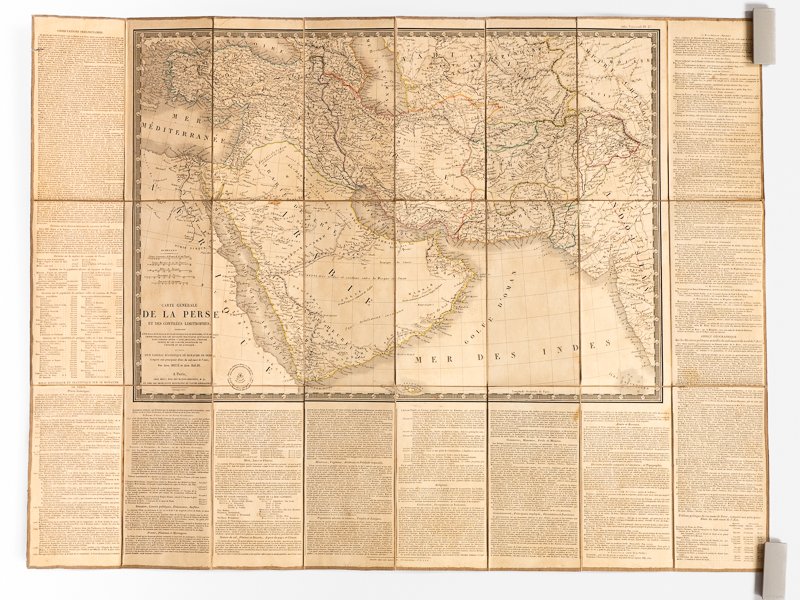 Accompagnée d'un Essai historique et statistique sur ce royaume, d'un aperçu géographique, sur les divisions politiques actuelles des pays compris entre l'Inde anglaise, l'Empire chinois et les limites orientales de l'Europe et de l'Afrique, et suivi d'un Tableau Statistique du Royaume de Perse, comparé aux principaux Etats du sud-ouest de l'Asie, 1 carte entoilée dépliante sous chemise et étui cartonné, décembre 1826, Planche 27 de l'Atlas Universel, Chez Brué, rue des Francs-Maçons, Paris, décembre 1826, 71,3 x 53 cm Jolie carte couvrant de l'Egypte et de l'Anatolie à l'Indoustan et aux contreforts de l'Himalaya, avec une belle vue de la Péninsule arabique de la Perse (Iran), du Beloutchistan et de l'Hindoustan (partie du Pakistan moderne), de l'Afghanistan, etc. Etat très satisfaisant (petite tache, double petit accroc marginal affectant lég. le texte en haut de feuille, fort accroc à l'étui, bon état par ailleurs) pour cette carte de très grand intérêt.