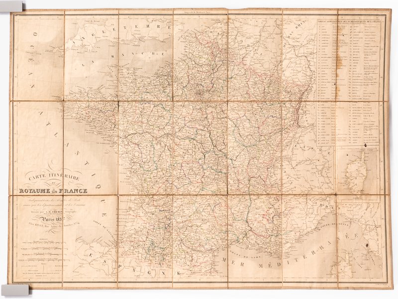 Dressée par A.R. Frémin, Chez Binet, Paris, 1837, 1 carte dépliante entoilée format 76,3 x 59,5 cm, limites des départements rehaussées en couleurs Jolie carte de France. Etat très satisfaisant (petites taches d'encre et qq. brunissures).